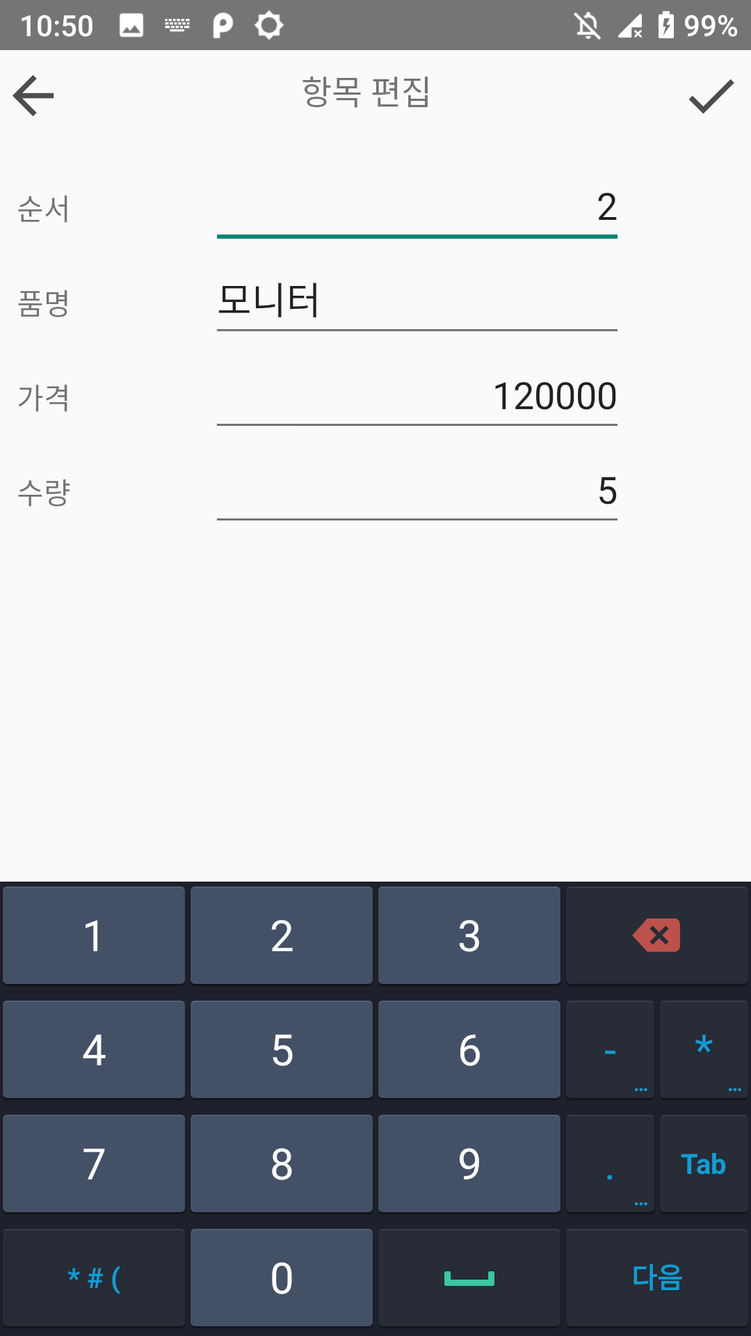 어플을 사용하기 간단한데요. 이렇게 항목에 품명, 가격 수량을 넣고 저장하면 됩니다.